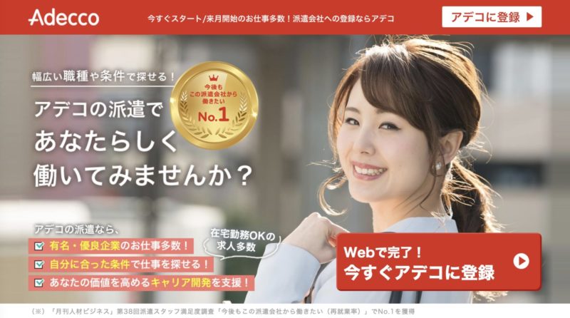 適職がわからないときにおすすめの転職支援サービス5選、4つ目は、派遣先企業との「ビジョンマッチング」を通じて、最適なお仕事を紹介してくれる【Adecco(アデコ)】です。