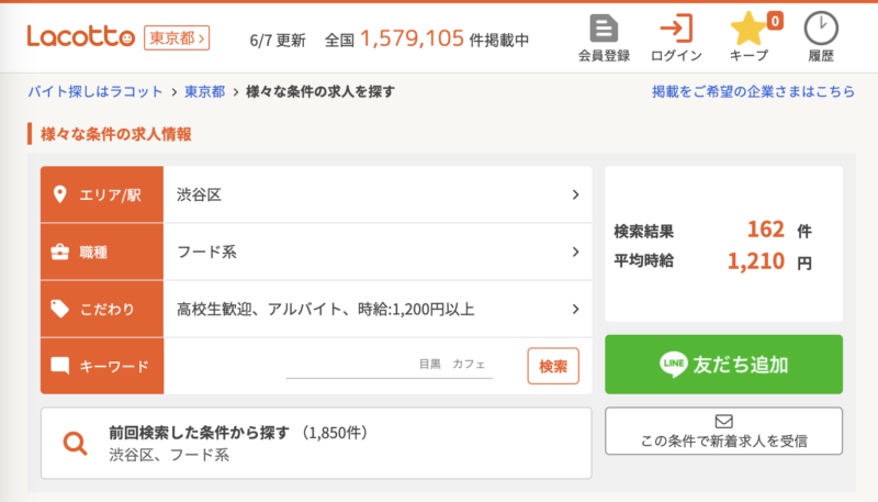 しかも、働きたいエリアや職種、希望条件などをチェックして求人検索すると、該当する求人数とともに平均時給も表示されるので、できるだけ時給が高いアルバイトを探している高校生や大学生の方には特におすすめ。